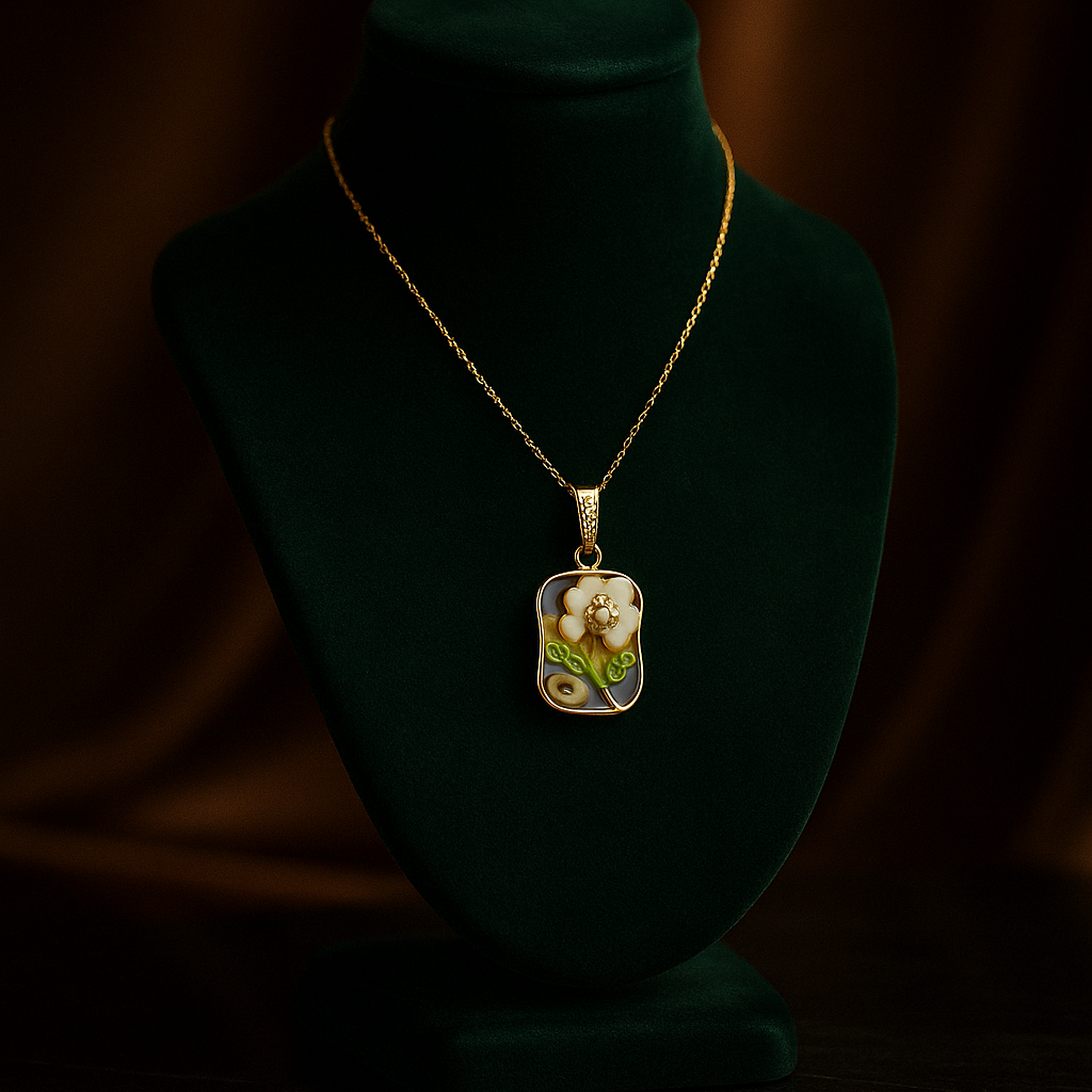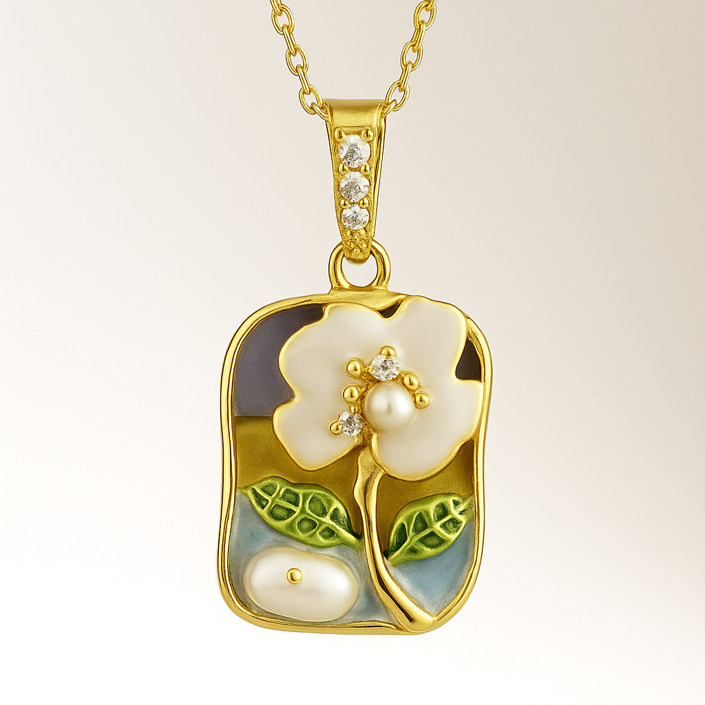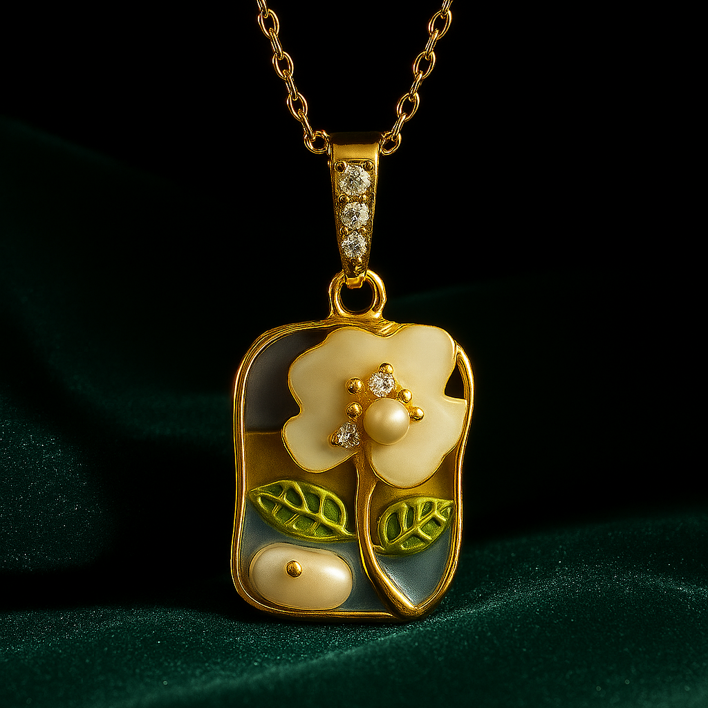 Set within a softly curved rectangular frame, this pendant captures a miniature tableau of natural grace: an ivory-hued flower sculpted from enamel and pearl, nestled among delicate green leaves and golden stems that seem to sway beneath a silent breeze. At its center, a sparkling round-cut stone blossoms like morning dew on velvet petals.